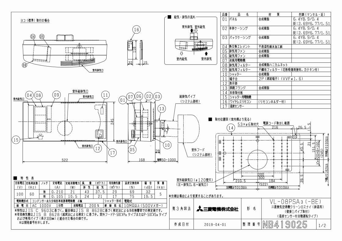 VL-08PSA3排湿用 ロスナイ 冬季結露防止用 壁掛1パイプ取付タイプ 適用畳数目安:8畳湿度センサー自動運転 ワイヤレスリモコンタイプ 電気式シャッター付三菱電機 24時間 換気空清機ロスナイ